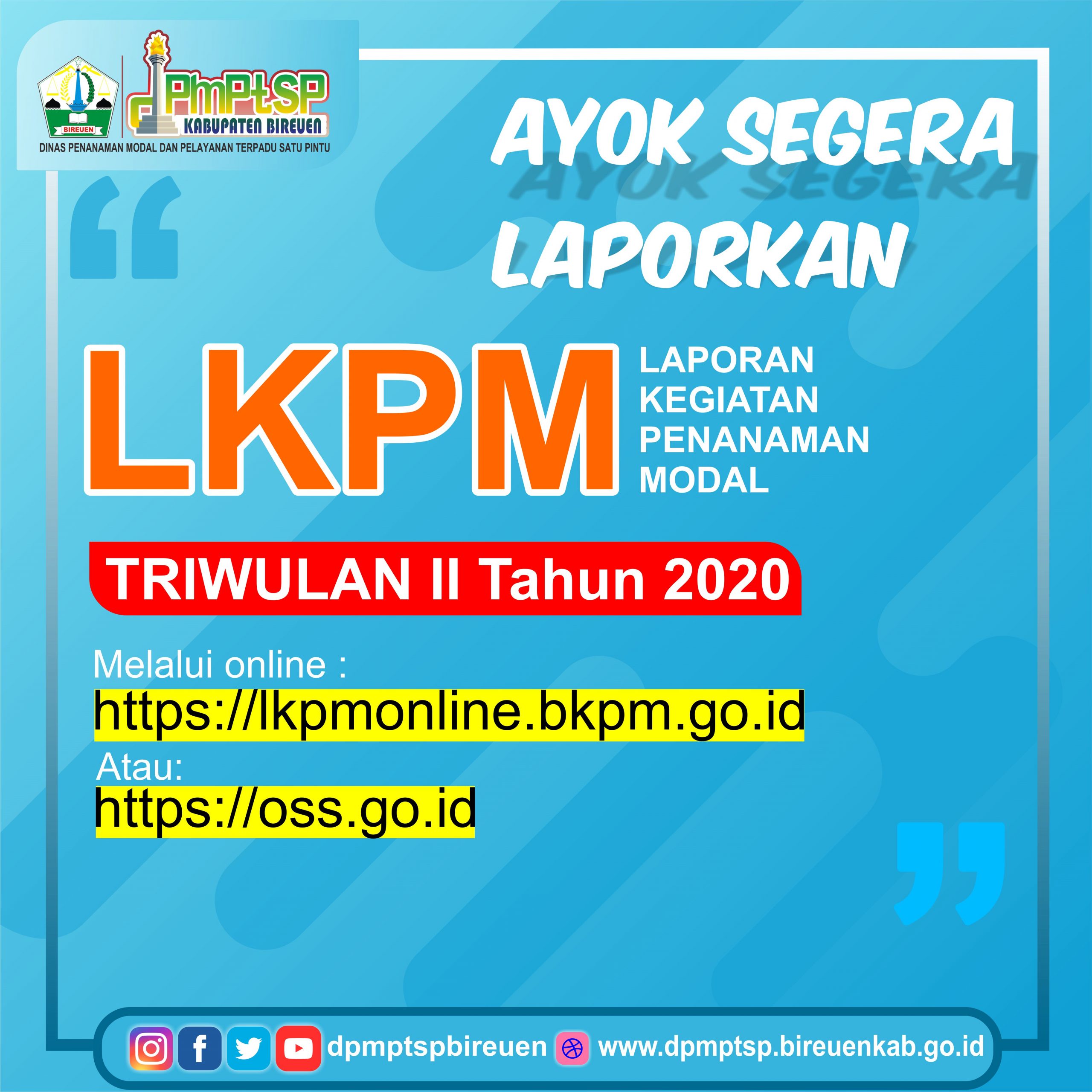 Sebagaimana Triwulan sebelumnya, diminta kepada setiap perusahaan Penanaman Modal agar menyampaikan LKPM Triwulan II (April-Juni) Tahun 2020 dengan waktu penyampaian dimulai sejak tanggal 1 – 10 Juli 2020.