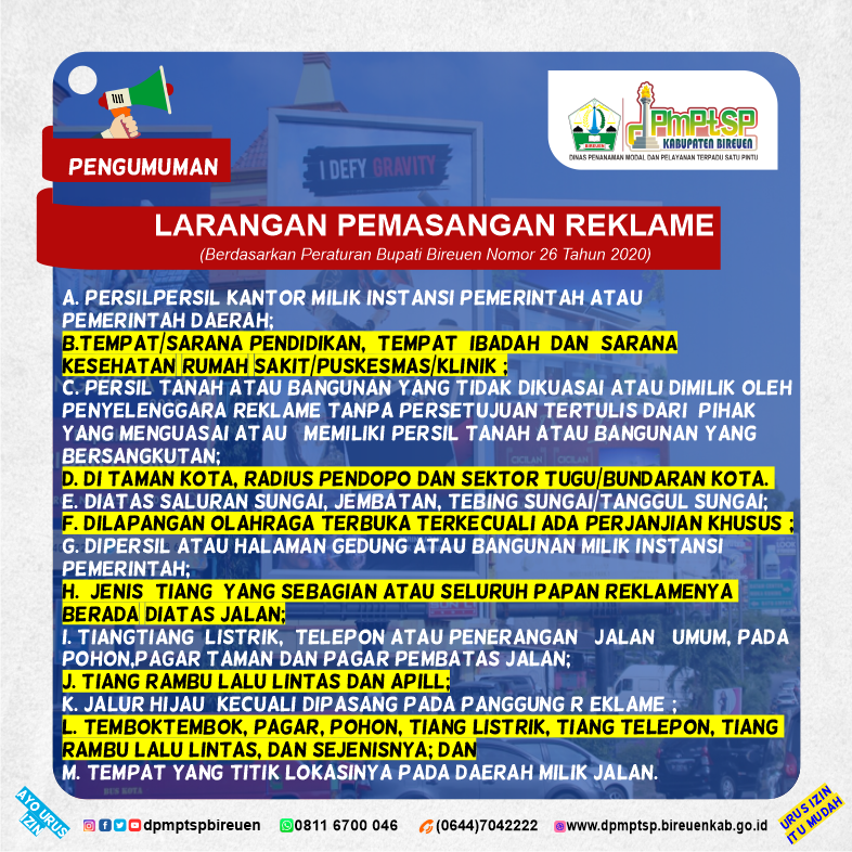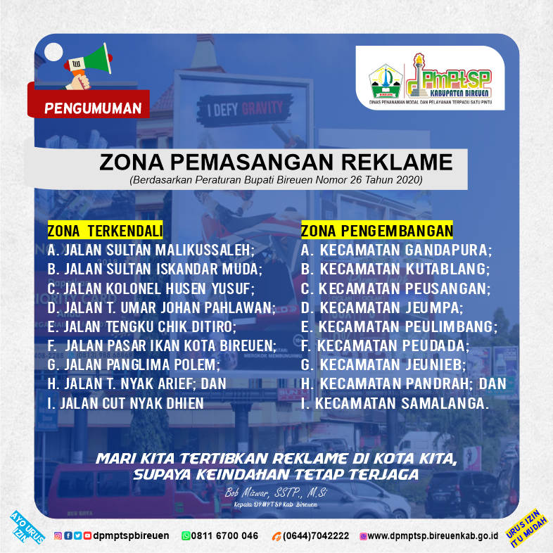 BIREUEN – Guna mensterilkan pemanfaatan ruang pemasangan papan reklame, baliho, poster, neon box toko tanpa izin, maka dalam waktu dekat ini Dinas Penanaman Modal dan Pelayanan Terpadu Satu Pintu (DPMPTSP) Kabupaten Bireuen segera melakukan penertiban.